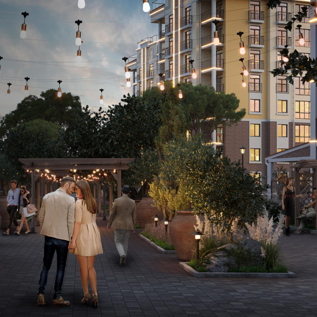 Освещение территории продумано таким образом, чтобы создать комфортные условия в любое время суток. Внутренний двор стал пространством для встреч, прогулок и семейного отдыха, где каждый житель сможет насладиться красотой окружающей природы, не покидая пределы комплекса.
